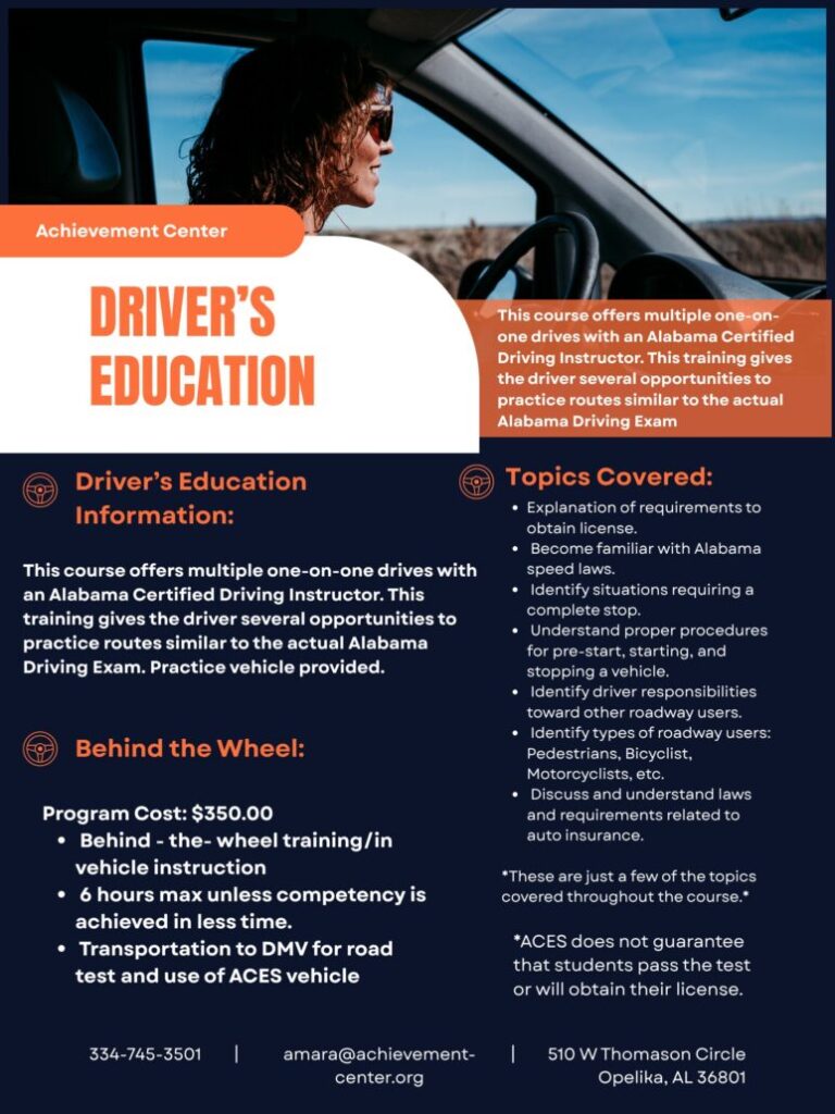 Driver’s Education Behind-the-Wheel Class– This course offers multiple one-on-one drives with an Alabama Certified Driving Instructor. The student will receive a maximum of 6 hours of training or until competency is achieved. An ACES modified driver’s education vehicle will be used for training and when taking the road test. Transportation to the DMV for the road test is included in the cost of the class.