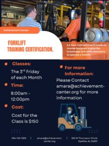 A course designed to provide the knowledge and skill necessary to safely operate a forklift in the workplace. Material will be presented in a classroom setting as well as hands on training using the forklift. A written and application test is given at the end of the class. An Operator Training Certificate is presented to those who pass.